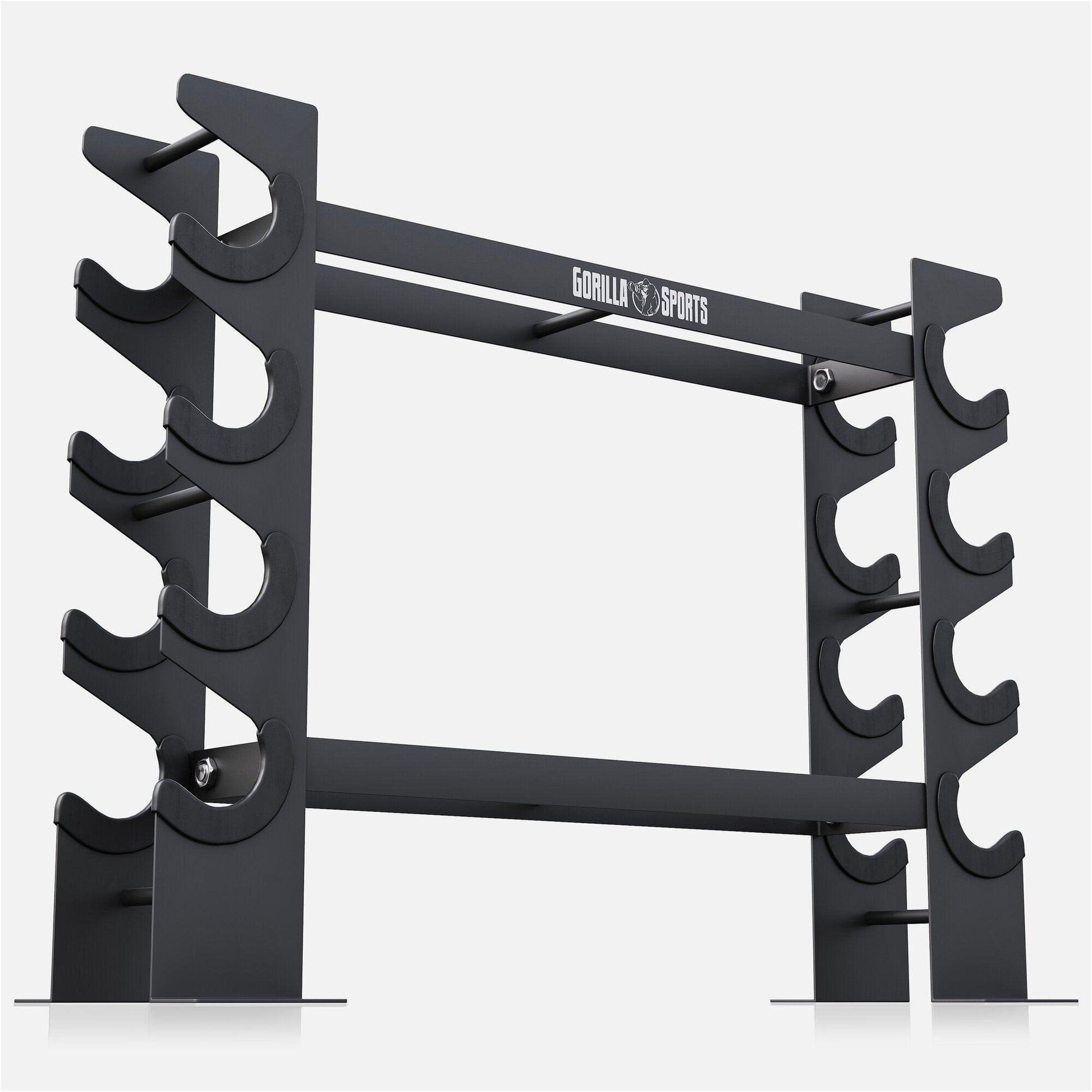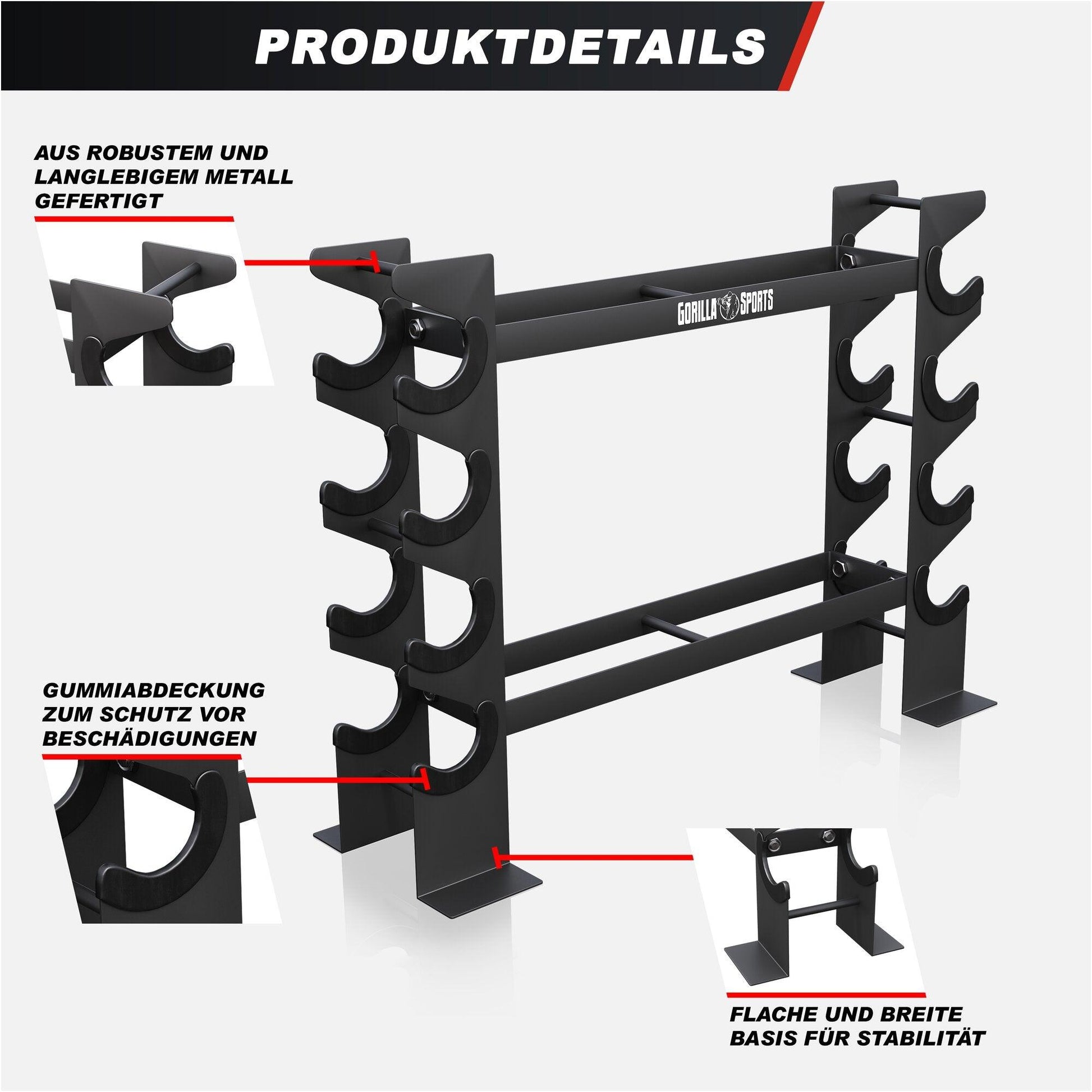 Mit dem GORILLA SPORTS® Hantelständer schaffst Du nicht nur Ordnung in Deinem Fitnessbereich, sondern bringst auch Stil und Funktionalität in Dein Trainingsequipment. Egal, ob Du Deine Kurzhanteln nach dem Workout sicher ablegen möchtest oder einfach einen festen Platz für sie suchst – dieser Dumbbell Rack ist die perfekte Lösung. Mit 8 Ablagen auf 2 Ebenen bietet der Hantelständer reichlich Platz für Deine Kurzhanteln und hält sie jederzeit griffbereit. Gefertigt aus hochwertigem Stahl sorgt er für maximale Stabilität und eine Tragkraft von bis zu 300 kg – ideal für ambitionierte Athleten und Profi-Studios.