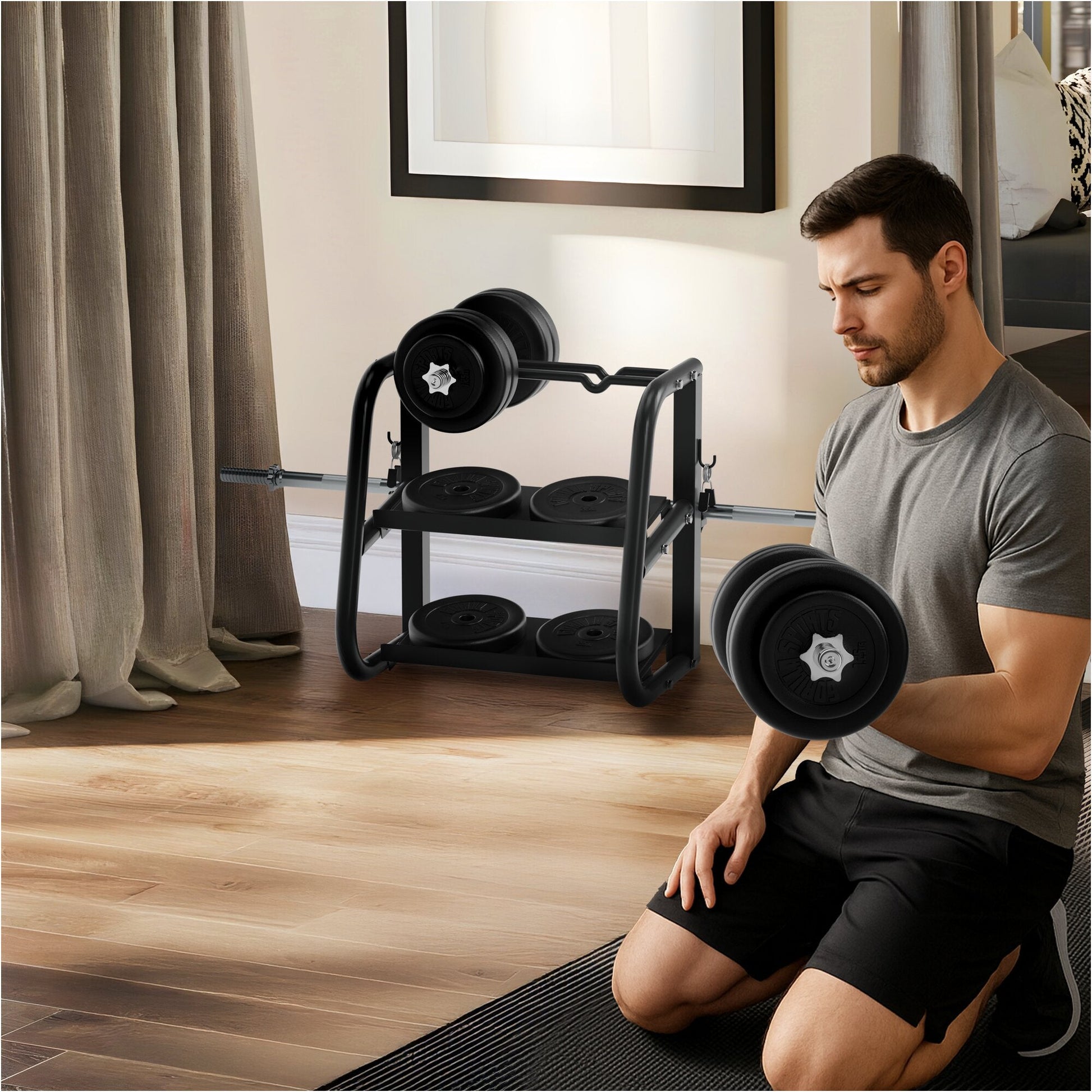 Suchst Du eine clevere Lösung für Dein Homegym oder Deinen Trainingsbereich? Unser Hantelständer überzeugt durch Funktionalität und Design. Mit nur 13 kg Gewicht ist er leicht zu bewegen und dennoch extrem stabil. Sein edles Schwarz fügt sich nahtlos in jede Umgebung ein und sorgt für ein modernes Ambiente. Egal, ob im Homegym, Studio oder Trainingsraum – mit diesem Hantelständer bleibt alles organisiert und stilvoll. Hol Dir die GORILLA SPORTS® Hantelablage und genieße die perfekte Kombination aus Funktionalität, Stil und Langlebigkeit!