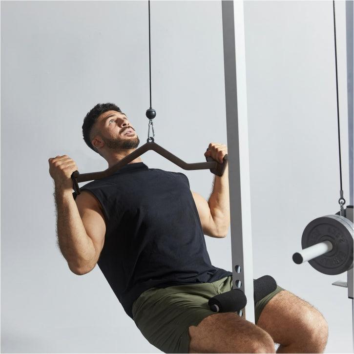 Die Latzuggriffe werden lediglich in der entsprechenden Vorrichtung eingeklickt und sind direkt danach betriebsbereit. Je nachdem, ob Du Deine Hände dann weiter außen oder innen platzierst, kannst Du andere Bereiche Deines Rückens bzw. Deiner Schultern fokussieren.
